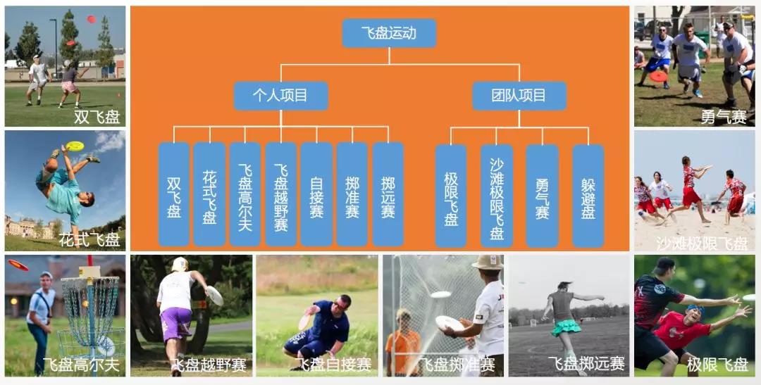 飞盘运动始于美国,经过70年的发展,已形成数十种以飞盘为载体的一类运动,其中以下几项为当前较为常见的比赛类别。
