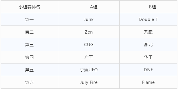 本次比赛分为两组进行,每组6只队伍,先进行组内的循环赛,在小组赛的比赛中,香港Junk和香港Double T,以全胜的战绩分别获得A,B组的小组冠军。